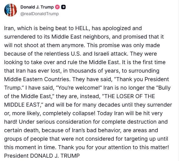 “Іран, який зазнав нищівної поразки, вибачився і капітулював перед своїми сусідами на Близькому Сході, пообіцявши більше не стріляти в них. Ця обіцянка була дана тільки через безжальні атаки США та Ізраїлю. Вони прагнули захопити і правити Близьким Сходом”, – стверджує американський лідер.